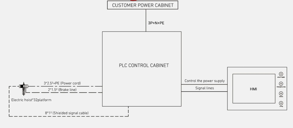 Комплексное управление с размещением всех компонентов в одном шкафу: питающие кабели и сигнальные линии.